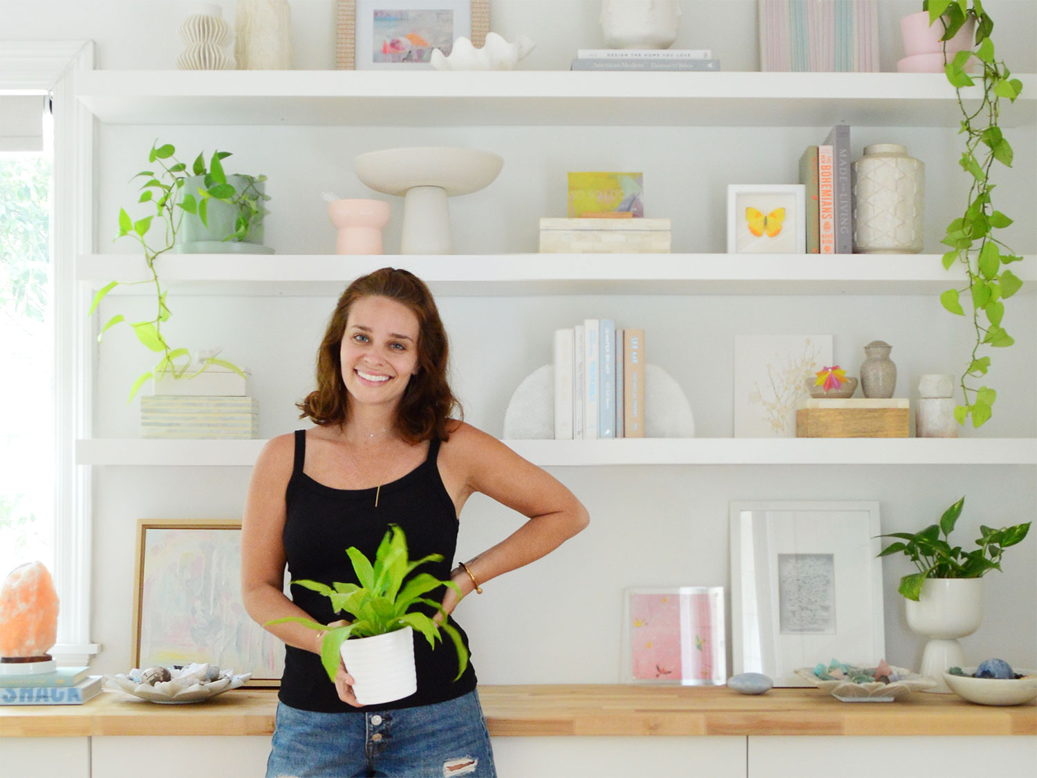 Three feels like it fills the space well without making each shelf too cramped or too spaced out. Plus, there’s just enough room here for the items we want. We already have two tall bookshelves upstairs with lots of books, so we like to use those for some books, but also mix in plants, art, and other items that we love and want to see every day.