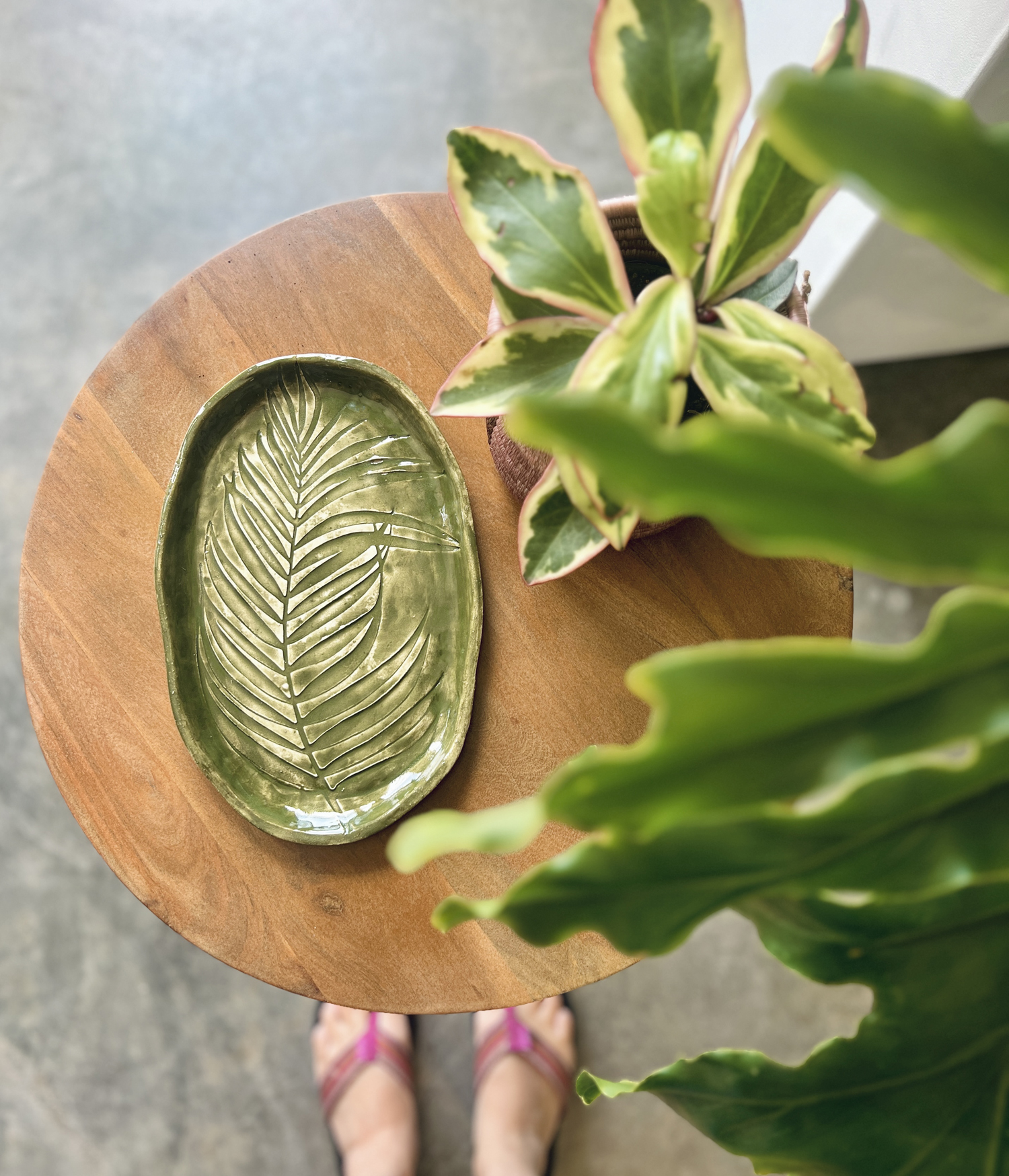 I have a slight obsession with botanical ceramics, so much so that I incorporate palm and floral motifs into pieces from my local studio. I’m experimenting with different techniques, most recently I used laser cut palms pressed into clay to make a decorative tray with irregular edges and an olive glaze. I like this prototype so much I’m making more in various colors to sell in my local shop.