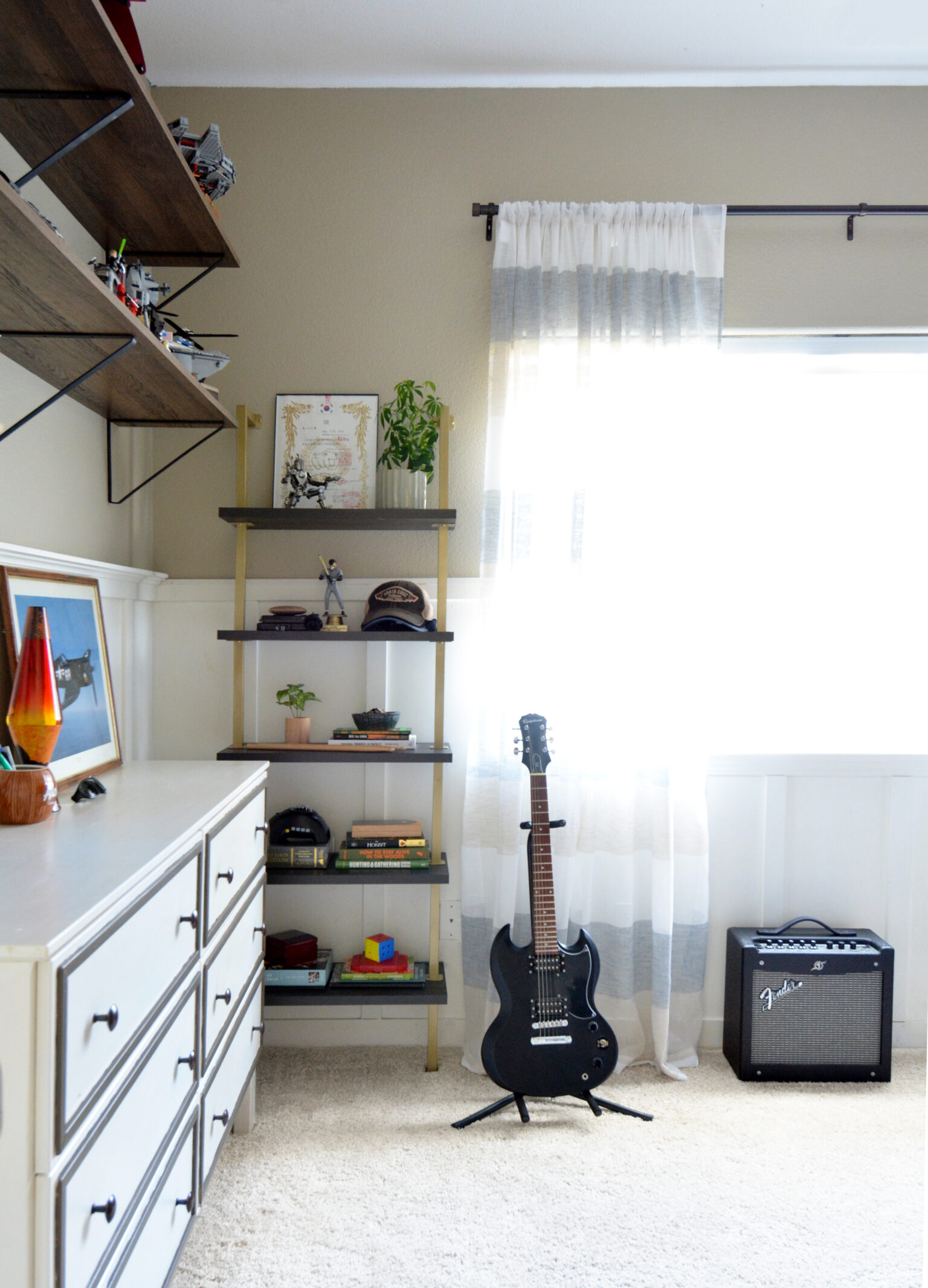 The wall shelves and brackets are from Lowe’s and are perfect for the space inside the dresser. He needed a place to store LEGOs from years ago, they were cool and he was proud of them, so we added two ledges to display them on a high.
